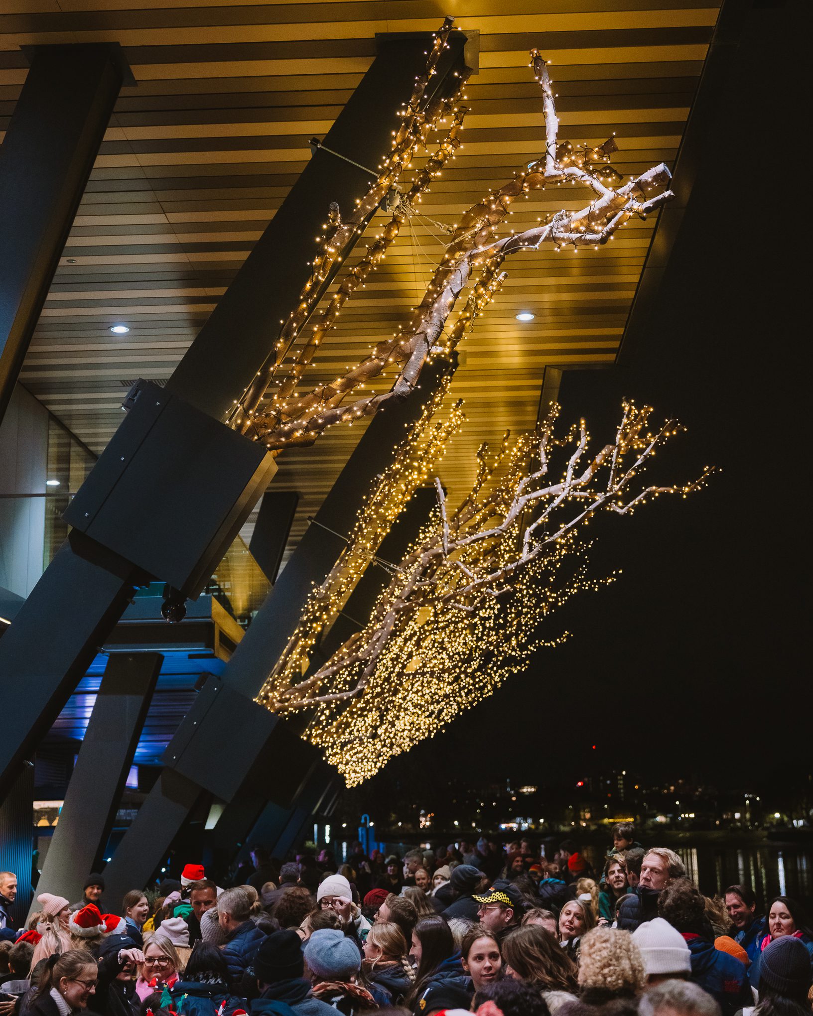 The riverside setting immediately establishes a sense of occasion, with panoramic views across the Thames providing a striking festive backdrop. Guests arrive via a highly decorated riverwalk, entering the venue through a floral Christmas archway that marks the transition into an immersive celebration.