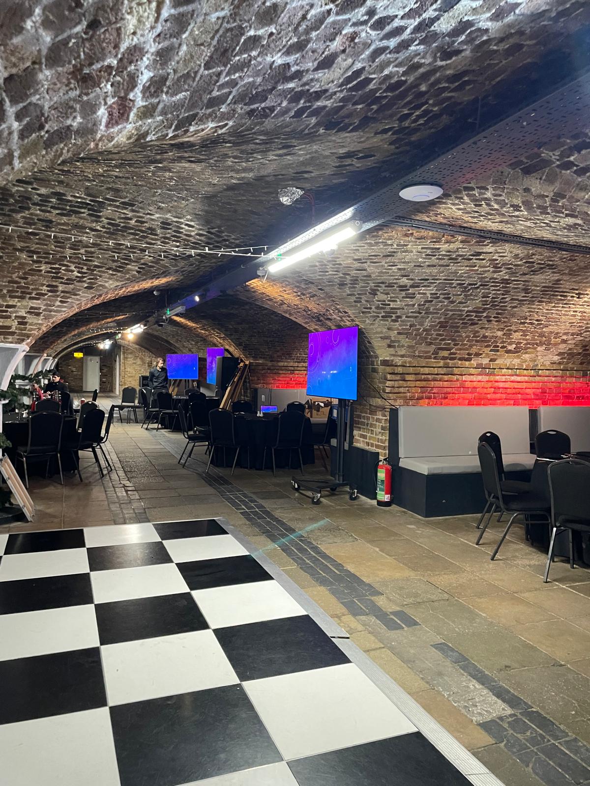 We amp up parties with entertainment that leverages our blank canvas for standout fun. Standard packages include a DJ and disco for lively beats, plus a PA system with mics for speeches or interactive moments, all set against the dramatic tunnels. For extras, we offer experiential options like live music bands or performers, utilizing our inhouse sound, bespoke lighting, and 10 large TVs for visuals or games. Addons can include custom production setups, such as themed photo booths or interactive installations, tailored to your theme. This flexibility lets guests dive into unique activities, from danceoffs to holiday trivia, making Dockside Vaults parties pulse with energy and surprise that competitors cant match in such an atmospheric space.