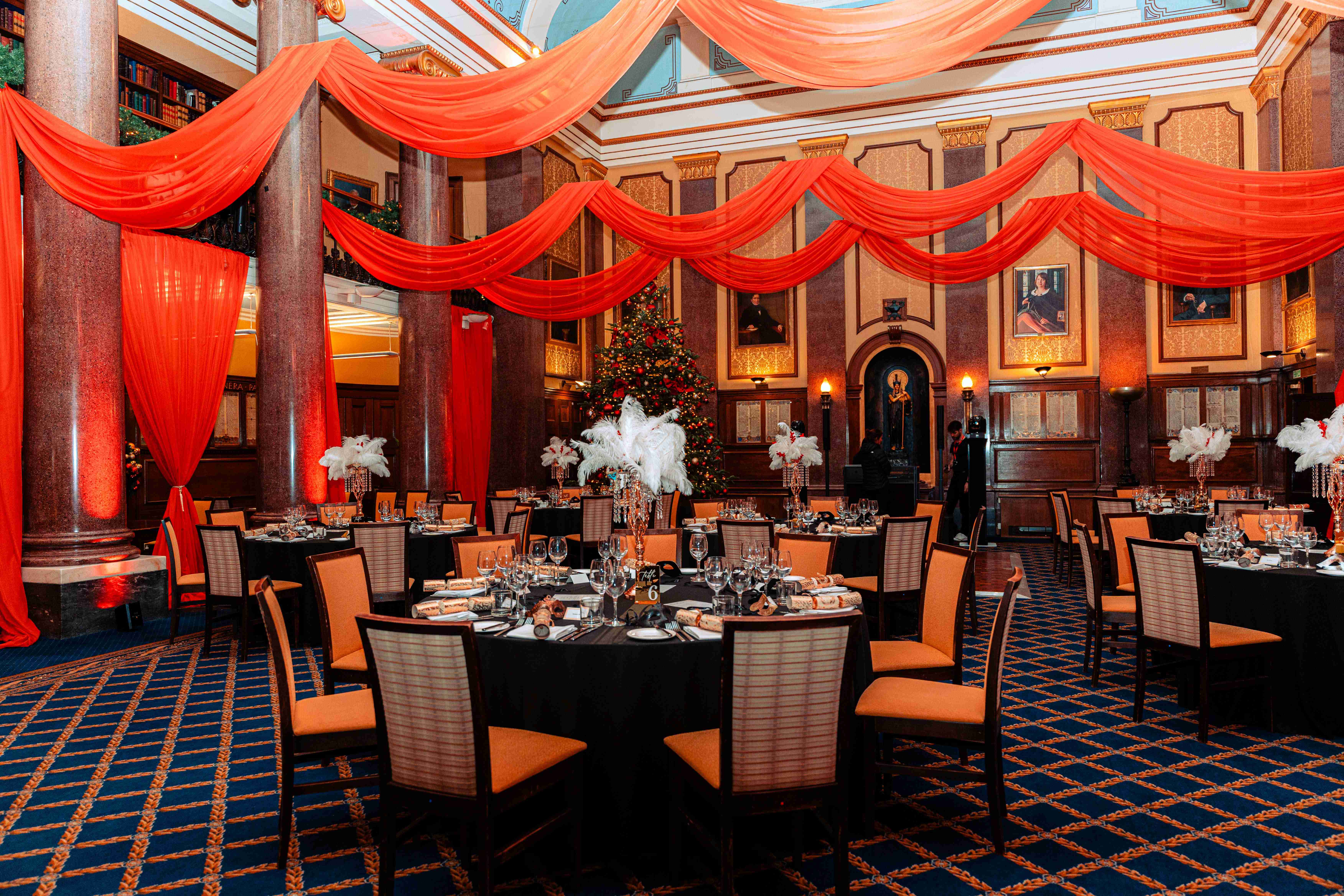 Unlike modern "blank canvas" spaces, our events benefit from the natural characteristics of a Grade II* listed building. We didn’t just decorate the rooms, we used and highlighted all aspects on site, including the stained glass, mahogany panelling, marbles, as active characters in our Masquerade Ball theme narrative.
